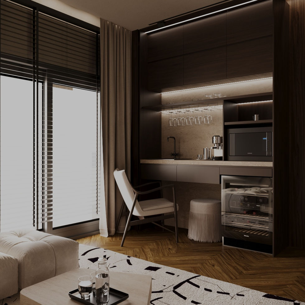 This project showcases modern, minimalist living rooms, elegant dining rooms, and sleek walk-in closets with neutral tones and stylish decor.